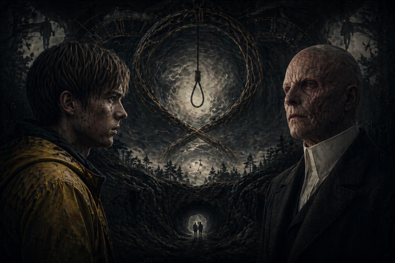 Это момент, где рождается будущий Адам. Миккель подчиняется судьбе и высшей цели, Йонас выбирает другой путь: если я не могу выйти — я стану тем, кто управляет лабиринтом.